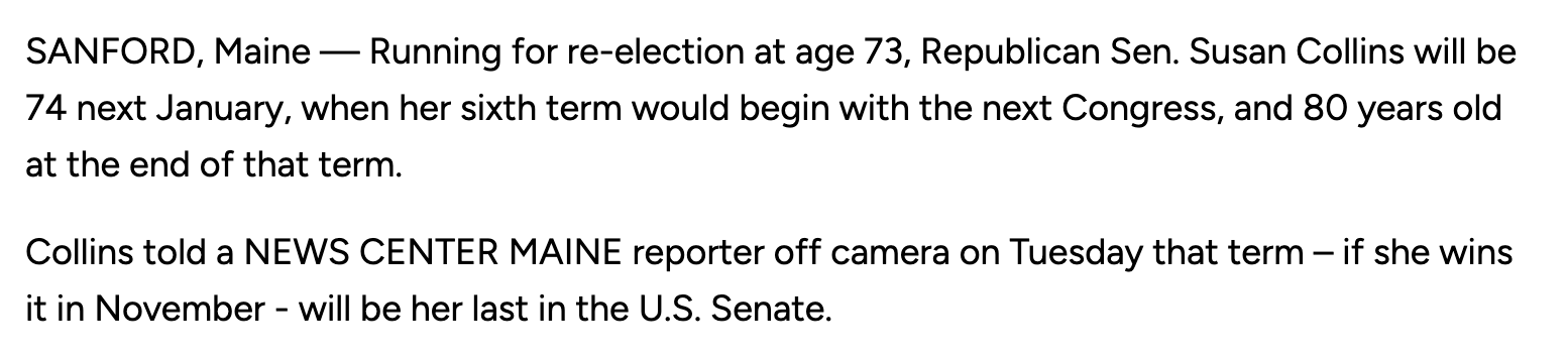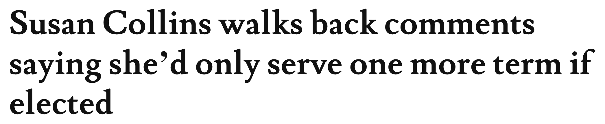 Augusta, Maine – Just one day after telling News Center Maine that a sixth term would be her last in the U.S. Senate if re-elected in November, Susan Collins is already walking it back.