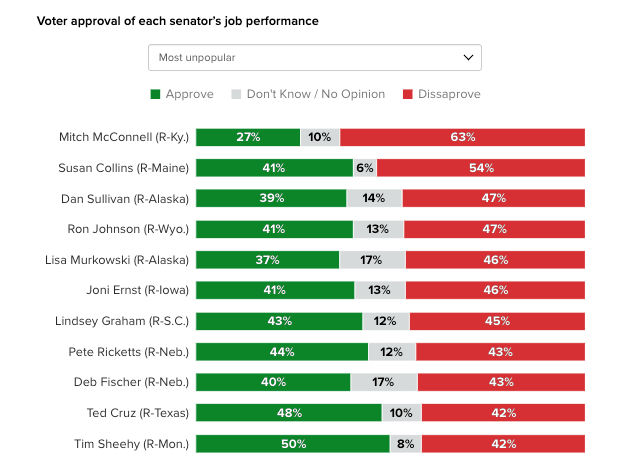 In national approval rankings of all 100 U.S. senators, she ranks as the second most unpopular senator in the United States, trailing only Mitch McConnell in voter disapproval.